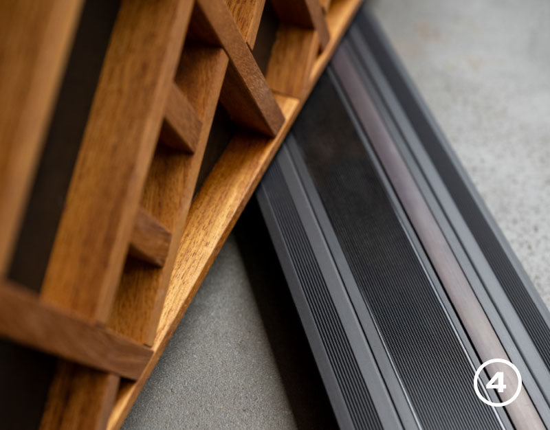 Die eingesetzte Nullschwelle von Alumat, dem Marktführer in diesem Bereich, basiert auf einer magnetisch angehobenen Aluminiumleiste. Bei geschlossenem Flügel wird die Dichtung aktiviert, eindringendes Wasser gezielt in die Schwelle geleitet und kontrolliert nach außen abgeführt. Das Ergebnis ist eine barrierearme Lösung mit hoher Dichtwirkung.